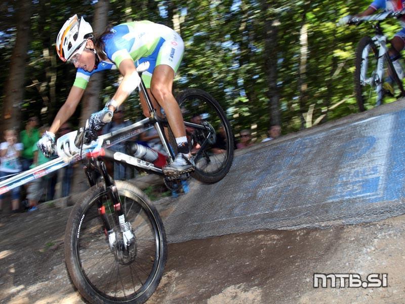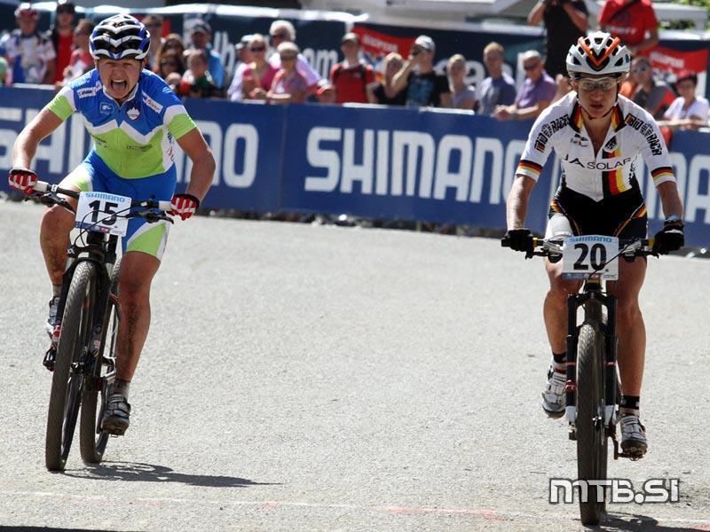 Najboljši slovenski tekmovalki v krosu sta danes vozili borbeno in pogumno, sploh Blaža pa je bila vse do zadnjega v boju za boljšo uvrstitev. Prvaka sta Bressetova in Schurter.