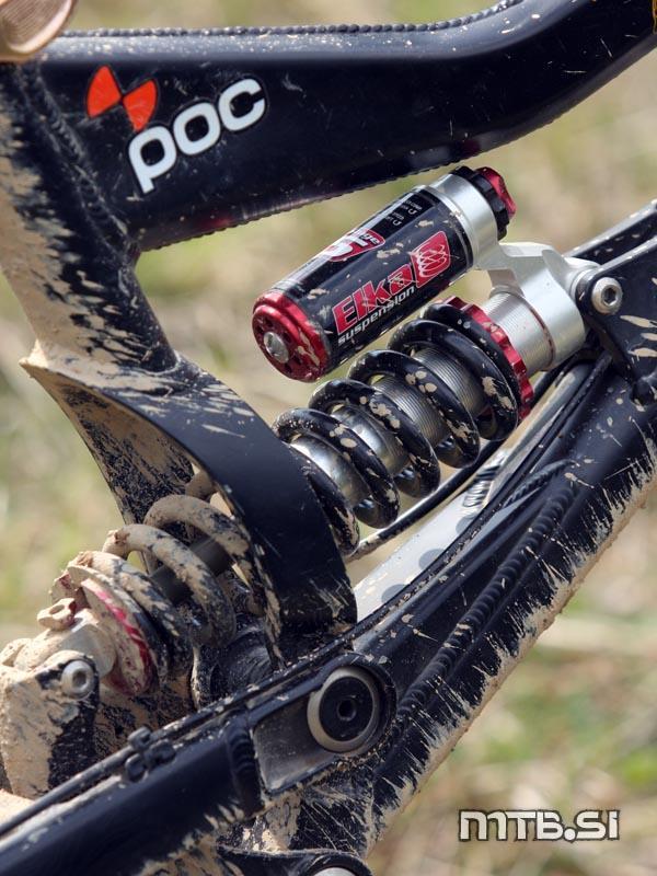 Ime kolesa Boot’R Romo je vsaj nenavadno, gre pa za nekakšno izpeljanko imena Steve Romaniuk – to je pravzaprav njegovo ‘signature’ kolo. Znani frirajder je v kolo vložil veliko svojega časa, pri snovanju modela pa je vključil tudi mnoge svoje osebne opremljevalce. Znotraj okvirja je tako vpet amortizer Elka Stage 5, izdelek kanadskega podjetja Elka Suspension, ki izdeluje amortizerje za vse vrste vozil. Stage 5 je za zdaj njihov edini amortizer za gorska kolesa, seveda pa je narejen izrecno za spust in frirajd. Steve in tudi Mongoose prisegata na vilice Manitou, Rok pa se je odločil za preverjeno klasiko Fox 40.