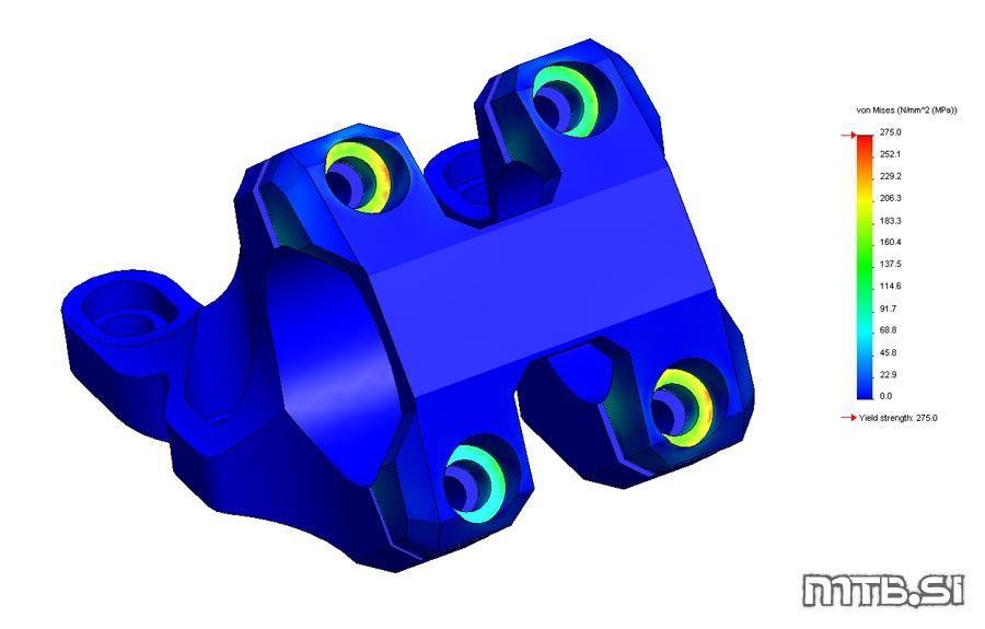 Še en primer, ki sem ga analiziral ne dolgo nazaj, vzrok pa je bila slaba montaža servisa. Koliko vas ima doma navorni (moment) ključ? Kar počasi ga dajte na seznam “potrebno kupiti”. Teža je v kolesarstvu eden od večjih faktorjev. Še tako dobra komponenta lahko z napačnim pristopom montaže vodi v katastrofo. Kapica toporišča je v veliki večini pritrjena s štirimi vijaki, ki jih je potrebno izmenično privijati. Na koncu pa se privije še vse z enakim momentom privitja. Vkolikor bi najprej privili en vijak, nato ostale, po vrhu še s prevelikim, različnim momentom privitja, se ustvarijo napetosti, ki vodijo v katastrofo. Že za par Nm (Newton metrov) pretirano privitje vijakov lahko v kapici toporišča naredi vtisek. Vsaka stopnička pomeni zarezni učinek. To je kraj, kjer se koncentrirajo napetosti, kraj, kjer se bo razpoka začela in nadaljevala v zlom. Če pa se s takšnim krmilom zaletimo drevo, oz. pademo na krmilo, se te napetosti v tem delu drastično povečujejo. Kar pomeni, da smo še bližje katastrofi oz. zlom.