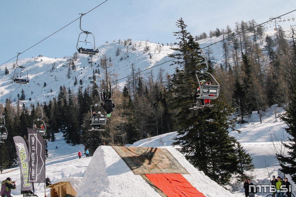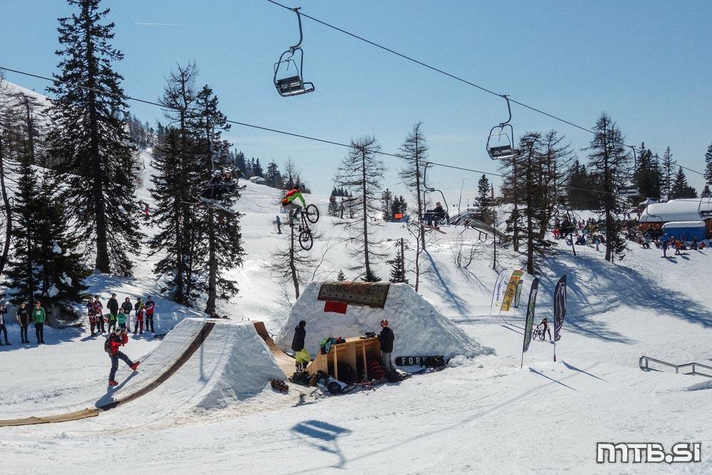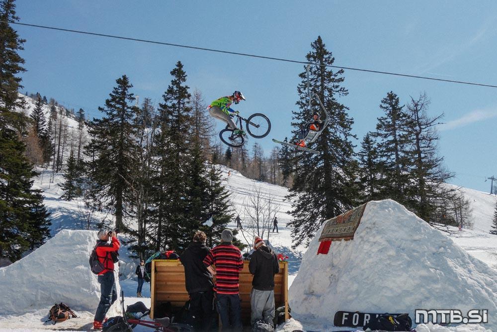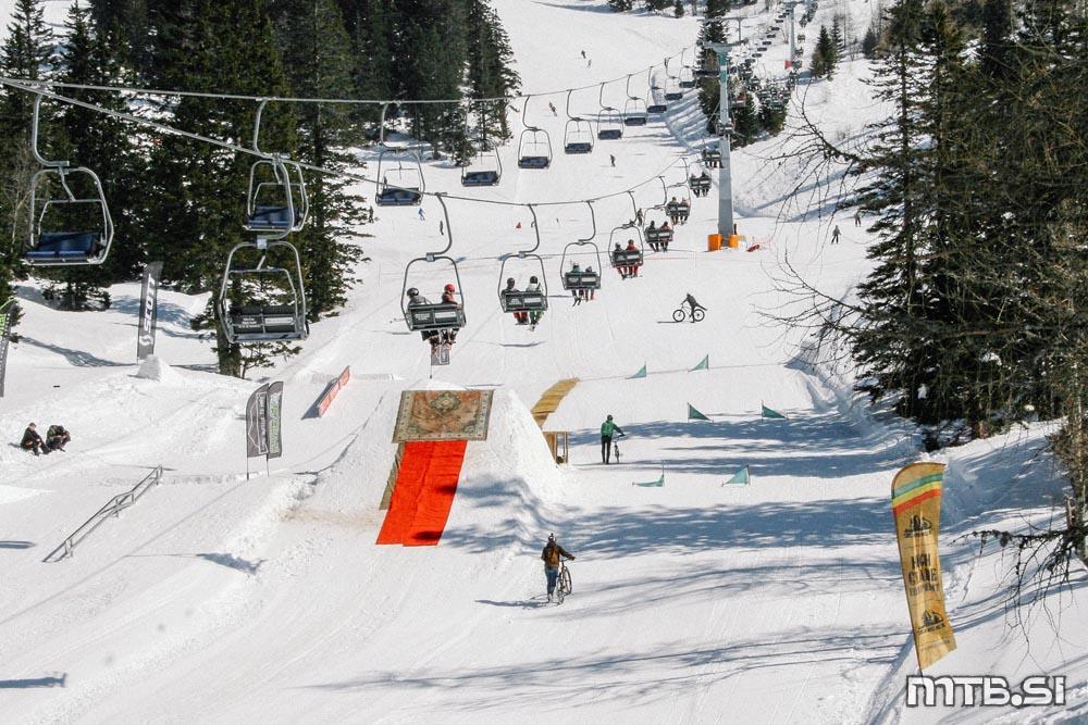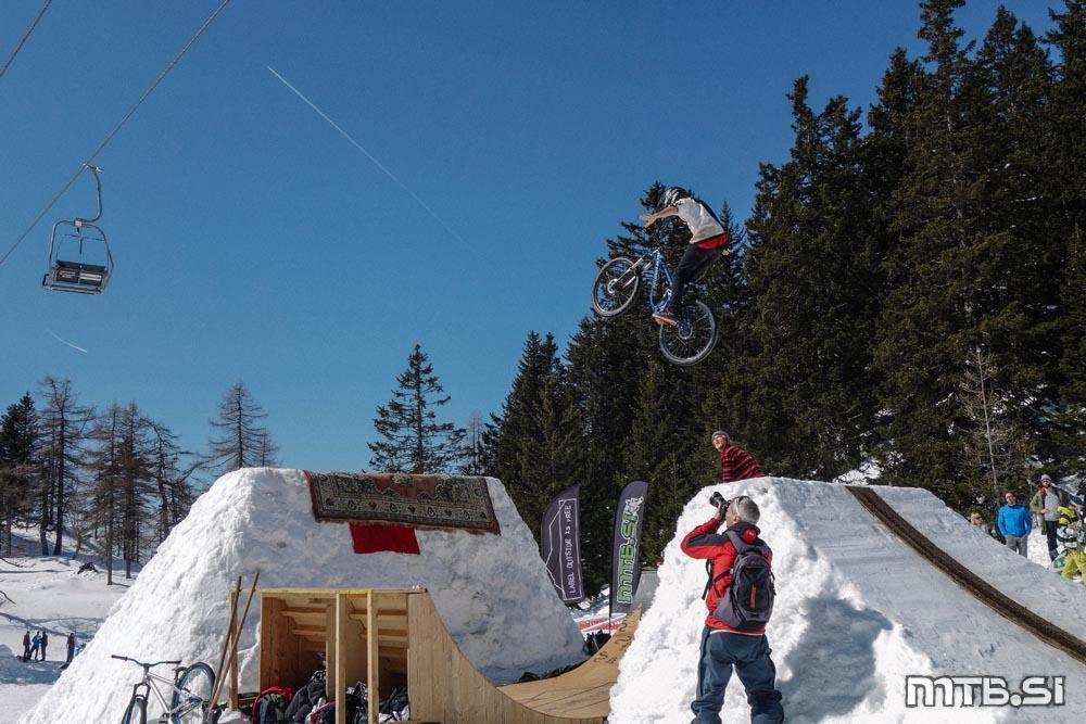 Bajkerji so imeli pravzaprav največ dela na kar treh frontah: na dirki v spustu Sneg’n’blat, ki ji je letos manjkalo blato, potekala pa je na Scottovem trailu; na paralelnem slalomu na najemni floti tolstih koles v freestyle parku v Tihi dolini, pod sedežnico na Zvoh; in pri letenju na res veliki skakalnici, ki si jo je na istem mestu zamislil Primož Tanko.
