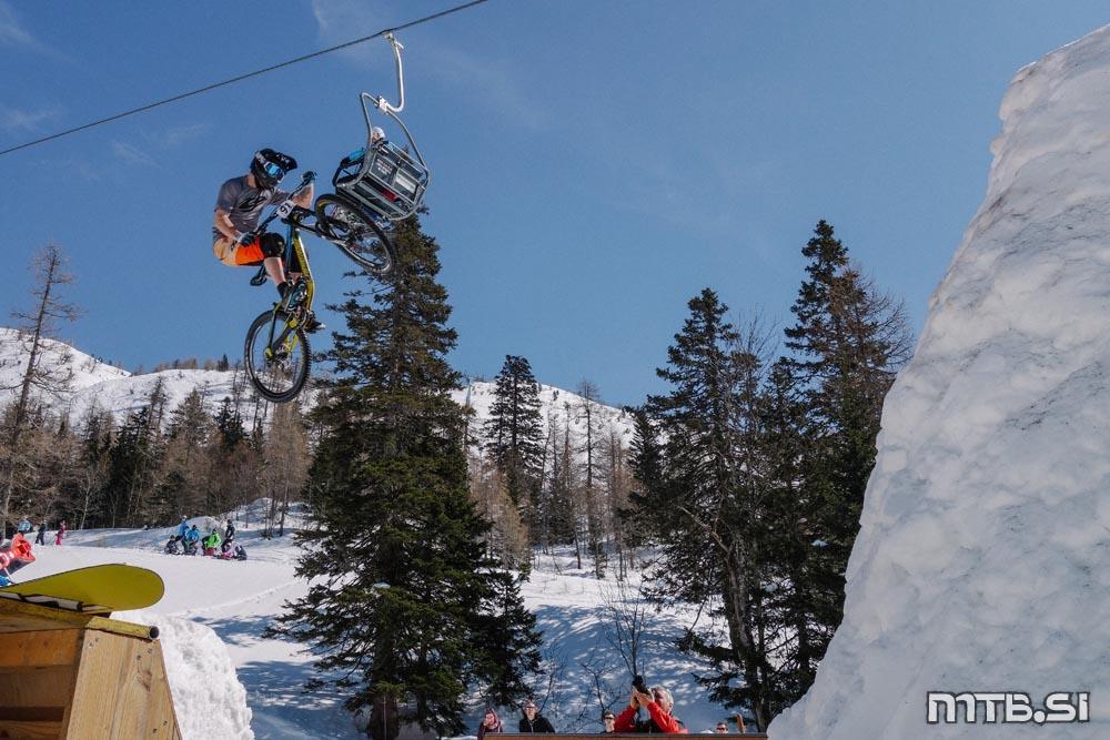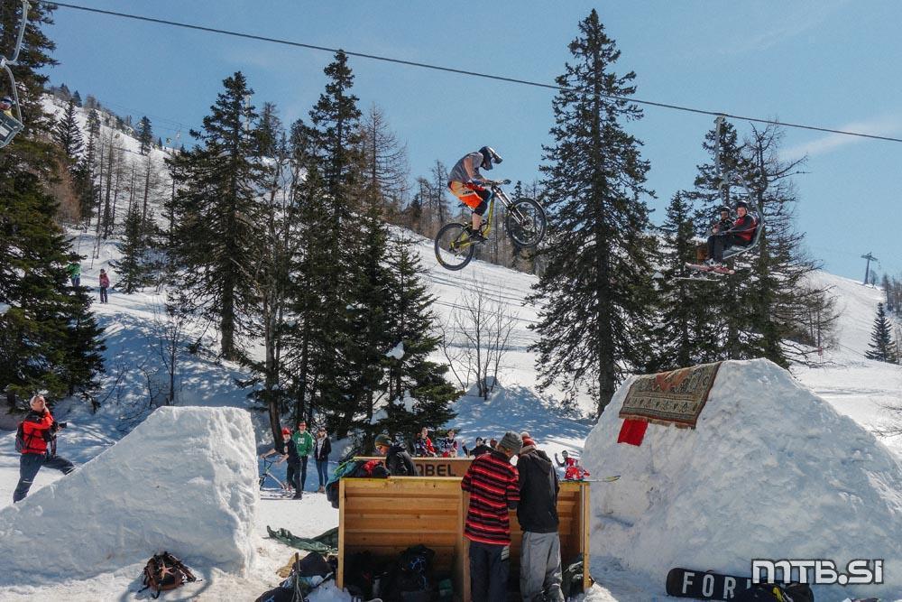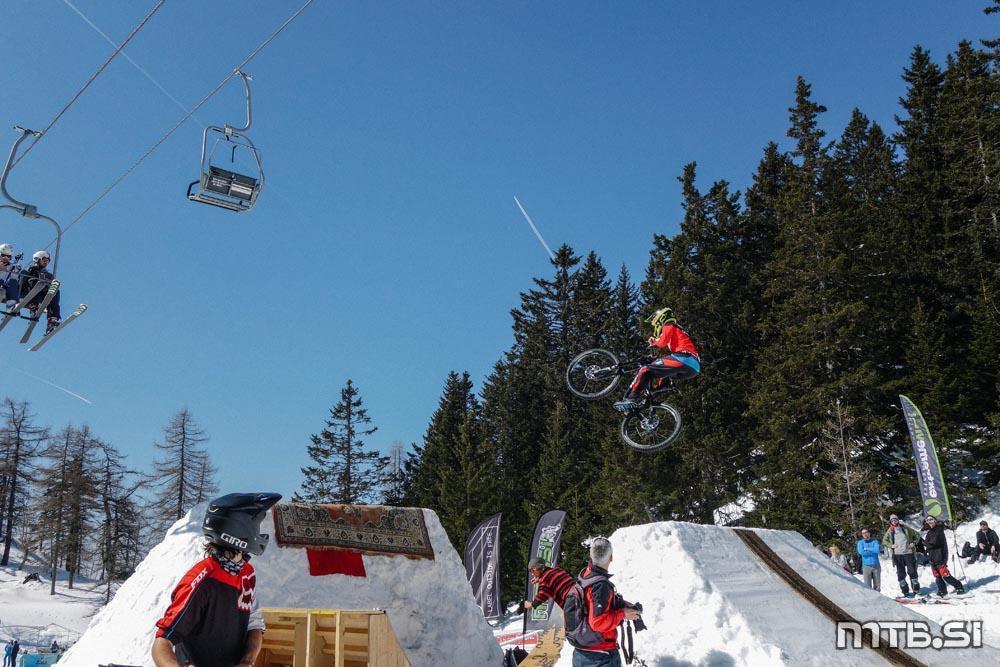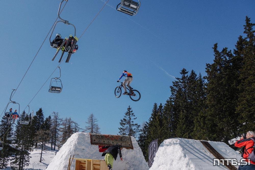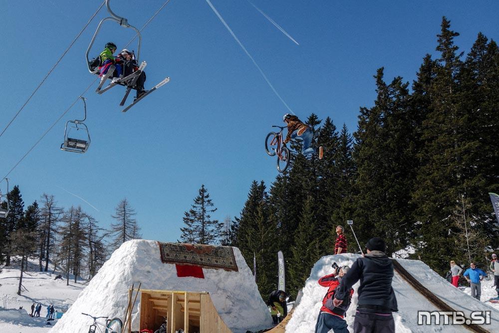 Bajkerji so imeli pravzaprav največ dela na kar treh frontah: na dirki v spustu Sneg’n’blat, ki ji je letos manjkalo blato, potekala pa je na Scottovem trailu; na paralelnem slalomu na najemni floti tolstih koles v freestyle parku v Tihi dolini, pod sedežnico na Zvoh; in pri letenju na res veliki skakalnici, ki si jo je na istem mestu zamislil Primož Tanko.